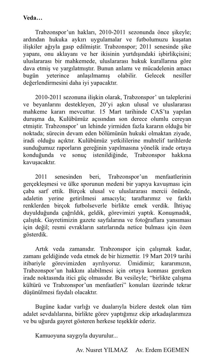 “Trabzonspor’un hakları, 2010-2011 sezonunda önce şikeyle; ardından hukuka aykırı uygulamalar ve futbolumuzu kuşatan ilişkiler ağıyla gasp edilmiştir” denilen açıklamada, CAS görülen son duruşmanın Trabzonspor açısından olumlu geçtiği belirtildi. Trabzonspor lehine kararlar olduğunu belirten avukatlar, açıklamada şu ifadeler yer verdiler: “Artık veda zamanıdır. Trabzonspor için çalışmak kadar, zamanı geldiğinde veda etmek de bir hizmettir. 19 Mart 2019 tarihi itibariyle görevimizden ayrılıyoruz. Ümidimiz; kararımızın, Trabzonspor’un hakkını alabilmesi için ortaya konması gereken irade noktasında itici güç olmasıdır. Bu vesileyle; “birlikte çalışma kültürü ve Trabzonspor’un menfaatleri” konuları üzerinde tekrar düşünülmesi faydalı olacaktır. Bugüne kadar varlığı ve dualarıyla bizlere destek olan tüm adalet sevdalılarına, birlikte görev yaptığımız ekip arkadaşlarımıza ve bu uğurda gayret gösteren herkese teşekkür ederiz.”