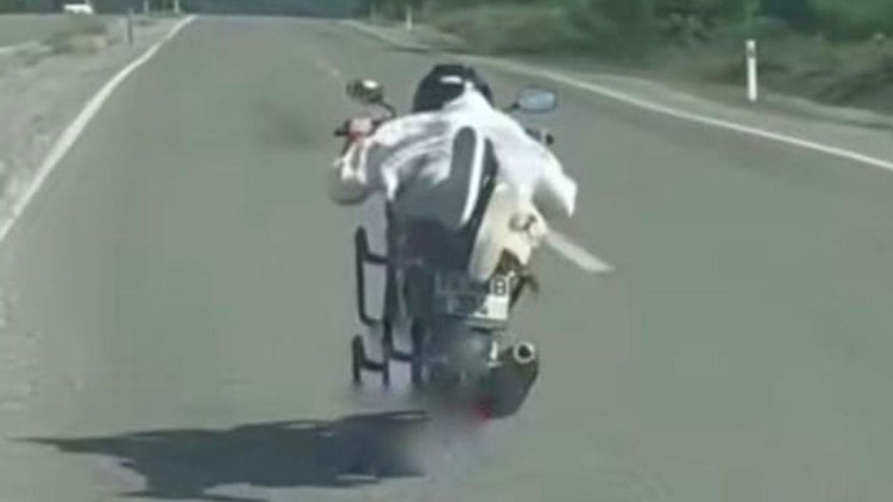 Bartın-Karabük kara yolunun Muratbey köyü mevkisinde dün B.K.'nin motosikletin üzerine yüzüstü uzanarak ilerlediği, kendisini ve trafiği tehlikeye düşürdüğü anlar, cep telefonu kamerasıyla görüntülendi. Görüntülerin sosyal medyada paylaşılması üzerine harekete geçen jandarma trafik ekipleri, B.K.'yi evinde yakaladı. Ekipler, motosikleti trafikten menederken, sürücü B.K.'ye 'trafik güvenliğini tehlikeye düşürme' suçundan 45 bin 841 TL idari para cezası uyguladı.