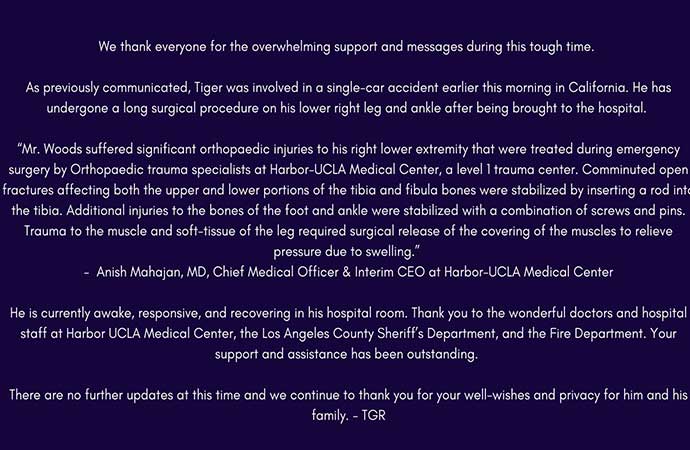 "Tiger Woods'un sağ bacak bileğinden cerrahi operasyon geçirdi. Sağlık durumu iyiye gidiyor. UCLA Tıp Merkezi’ndeki sağlık personeline ve Los Angeles polis teşkilatına teşekkür ederiz"