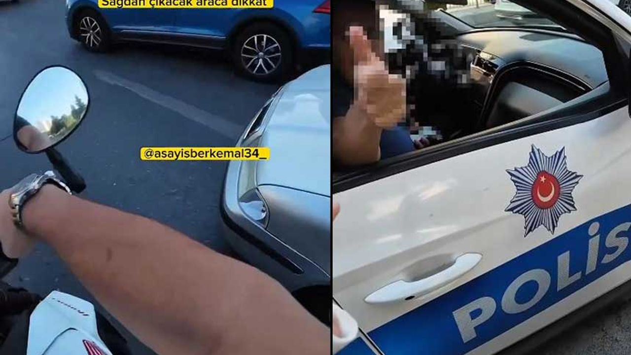 @arasiyberkalmel34_ isimli sosyal medya platformunda yayınlanan görüntülerde motosikletli, kendisini tehlikeye atan araç sürücüsünü polis ekiplerine şikayet etti. Hemen kenara gelen polis ve motosikletli arasında yaşanan diyaloglar ise sosyal medyada gündem oldu. Motosiklet sürücüsü ‘Beni öldürüyorlardı’ ifadesini kullanınca araç içindeki polis de ‘Tabancayla mı?’ diye sordu. Polis daha sonra 112’yi ara diyerek olay yerinden uzaklaştı.