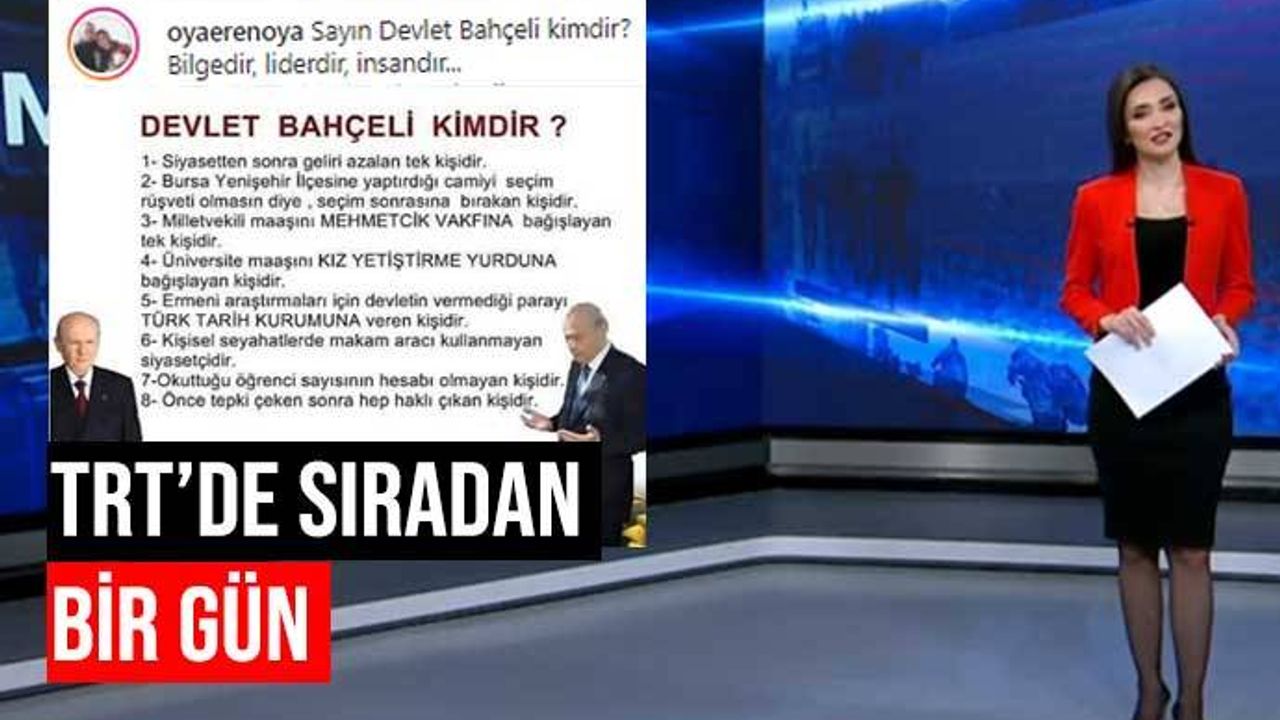 Öte yandan TRT kadrosundaki Eren'in MHP Genel Başkanı Devlet Bahçeli'ye ilişkin paylaşımı da dikkat çekti. Eren, paylaşımında "Sayın Devlet Bahçeli kimdir? Bilgedir, liderdir, insandır... #hareketinLideriDevletBahçeli" diye yazdı.