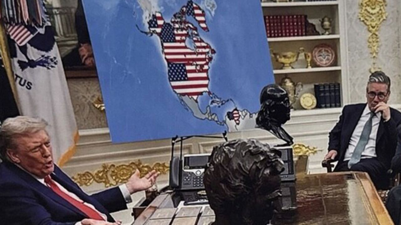 ABD Başkanı Donald Trump, sanal medya hesabından Grönland ve Kanada'yı ABD'nin bir parçası olarak gösteren harita paylaştı. Paylaşımda, Trump'ın Oval Ofis'te, aralarında Fransa Cumhurbaşkanı Emmanuel Macron, İtalya Başbakanı Giorgia Meloni, İngiltere Başbakanı Keir Starmer ve Avrupa Komisyonu Başkanı Ursula von der Leyen'in de bulunduğu NATO liderleriyle oturduğu görülüyor.