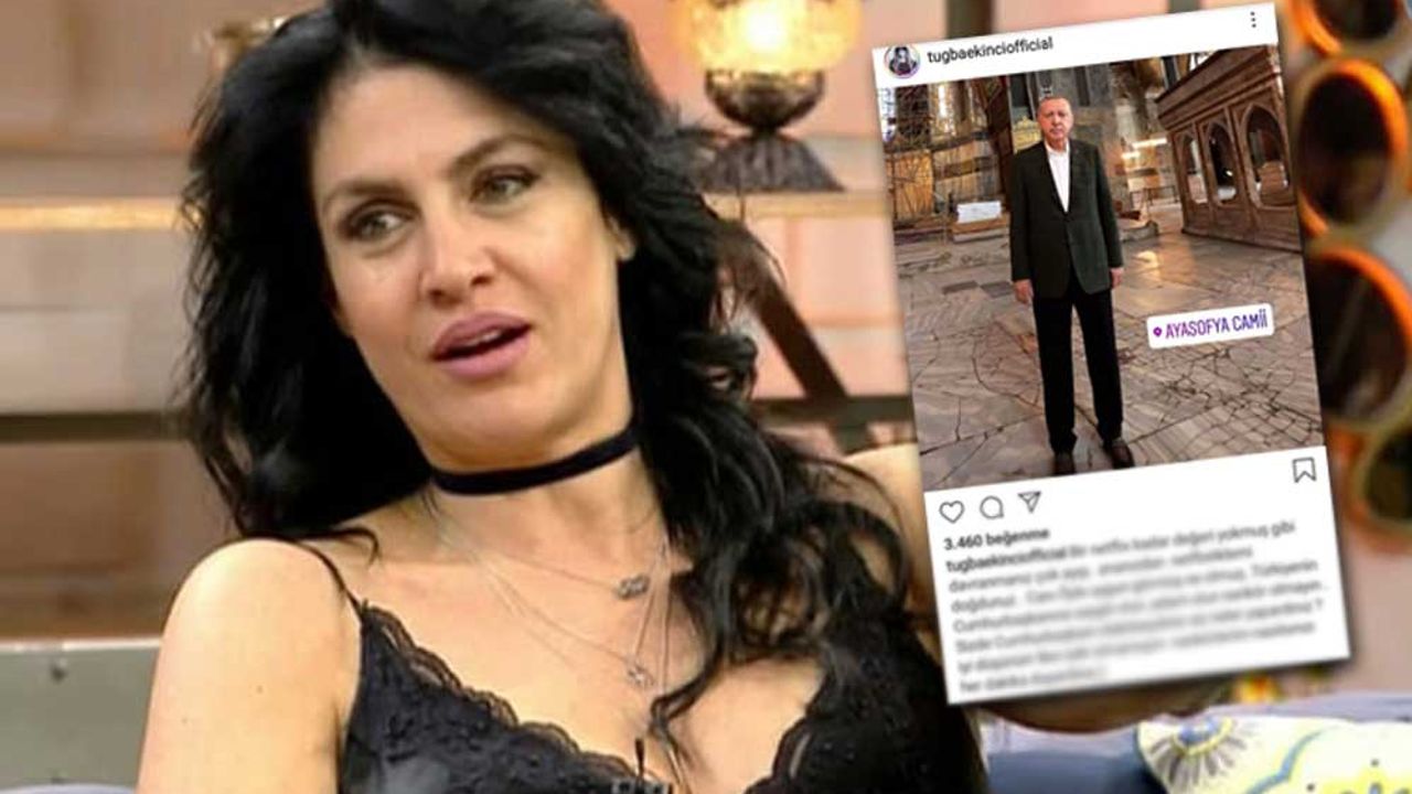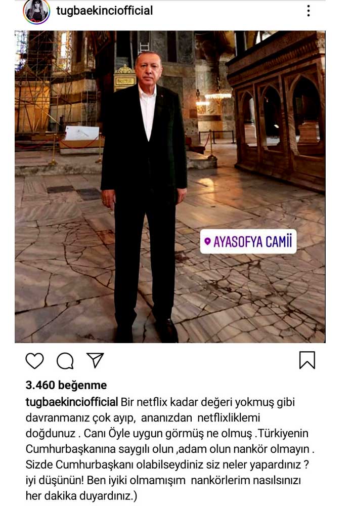 Şarkıcı Tuğba Ekinci, AKP'li Cumhurbaşkanı Recep Tayyip Erdoğan'ın Ayasofya ziyaretinden bir kareyi paylaşarak, "Bir Netflix kadar değeri yokmuş gibi davranmanız çok ayıp, ananızdan Netflix’le mi doğdunuz? Canı öyle uygun görmüş ne olmuş. Türkiye’nin Cumhurbaşkanı’na saygılı olun" ifadelerini kullandı.