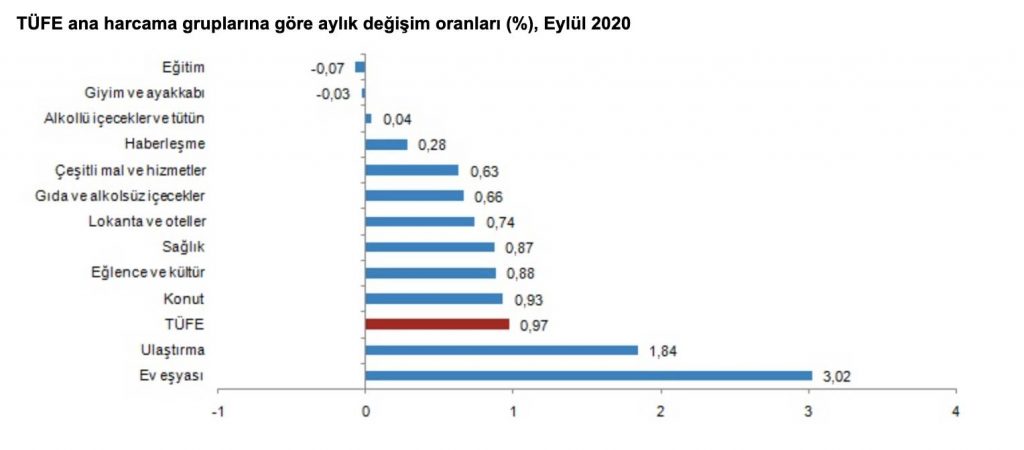 Ana harcama grupları itibarıyla 2020 yılı Eylül ayında azalış gösteren diğer ana grup ise yüzde0,03 ile giyim ve ayakkabı oldu. Buna karşılık, ana harcama grupları itibarıyla 2020 yılı Eylül ayında artışın yüksek olduğu gruplar ise sırasıyla, yüzde3,02 ile ev eşyası, yüzde1,84 ile ulaştırma ve yüzde0,93 ile konut oldu.