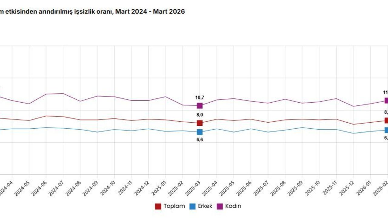 İstihdam edilenlerden referans döneminde işbaşında olanların, mevsim ve takvim etkilerinden arındırılmış haftalık ortalama fiili çalışma süresi 2026 yılı Mart ayında bir önceki aya göre 0,8 saat azalarak 41,7 saat olarak gerçekleşti. Zamana bağlı eksik istihdam, potansiyel iş gücü ve işsizlerden oluşan atıl iş gücü oranı 2026 yılı Mart ayında bir önceki aya göre 1,6 puan artarak yüzde 31,5 oldu. Zamana bağlı eksik istihdam ve işsizlerin bütünleşik oranı yüzde 21 iken işsiz ve potansiyel iş gücünün bütünleşik oranı yüzde 20,4 olarak gerçekleşti. (DHA)
