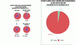 Ücretlilerin alım gücü kaybının ne düzeyde olduğunu anlamak açısından, en çok alım gücü kaybı yaşanan ürünler için bir hesaplama yapılmıştır. Bu hesaba göre bir önceki yılın aynı ayına göre enflasyon oranında artış alan ve net geliri 2500 TL olan bir ücretlinin 2018 yılı haziran ayında aldığı aynı miktar mal grubundan ürünü 2019 yılı haziran ayında alabilmesi için maaşının ne olması gerektiği tespit edilmiştir. Buna göre söz konusu ücretlinin geliri ile 2018 yılı Haziran ayında alabildiği kadar meyve alabilmesi için maaşının mevcuttan 330 TL daha fazla olması (2830 TL) gerekmektedir. Aynı miktarda ekmek ve tahıl ürünleri alabilmesi için ücretinin mevcuttan 208 TL (2708 TL) fazla olması, aynı miktar et alabilmesi için ücretinin 2645 TL, aynı miktar katı ve sıvı yağ alabilmesi için ücretinin 2653 TL, aynı miktar süt ve süt ürünleri alabilmesi için ücretinin 2621 TL olması gerekmektedir. Buna karşın ücretli geliri ile geçtiğimiz ayın aynı dönemine göre daha fazla sebze alabilmektedir.Kamu işçisinin önce kayıpları telafi edilmeli