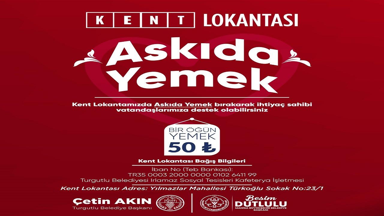 Turgutlu Belediyesi ve Manisa Büyükşehir Belediyesi tarafından hayata geçirilen, başta öğrenciler ve emeklilere yönelik olmak üzere dar gelirli vatandaşların 4 çeşit sağlıklı ve kaliteli yemeğe uygun fiyatla ulaşabildiği Kent Lokantası’nda ‘Askıda Yemek’ dönemi başladı. Uygulama sayesinde hayırseverler diledikleri kadar yemek bedelini askıya bırakarak yemeklerin ihtiyaç sahiplerine ulaştırılmasına katkıda bulunabilecek.