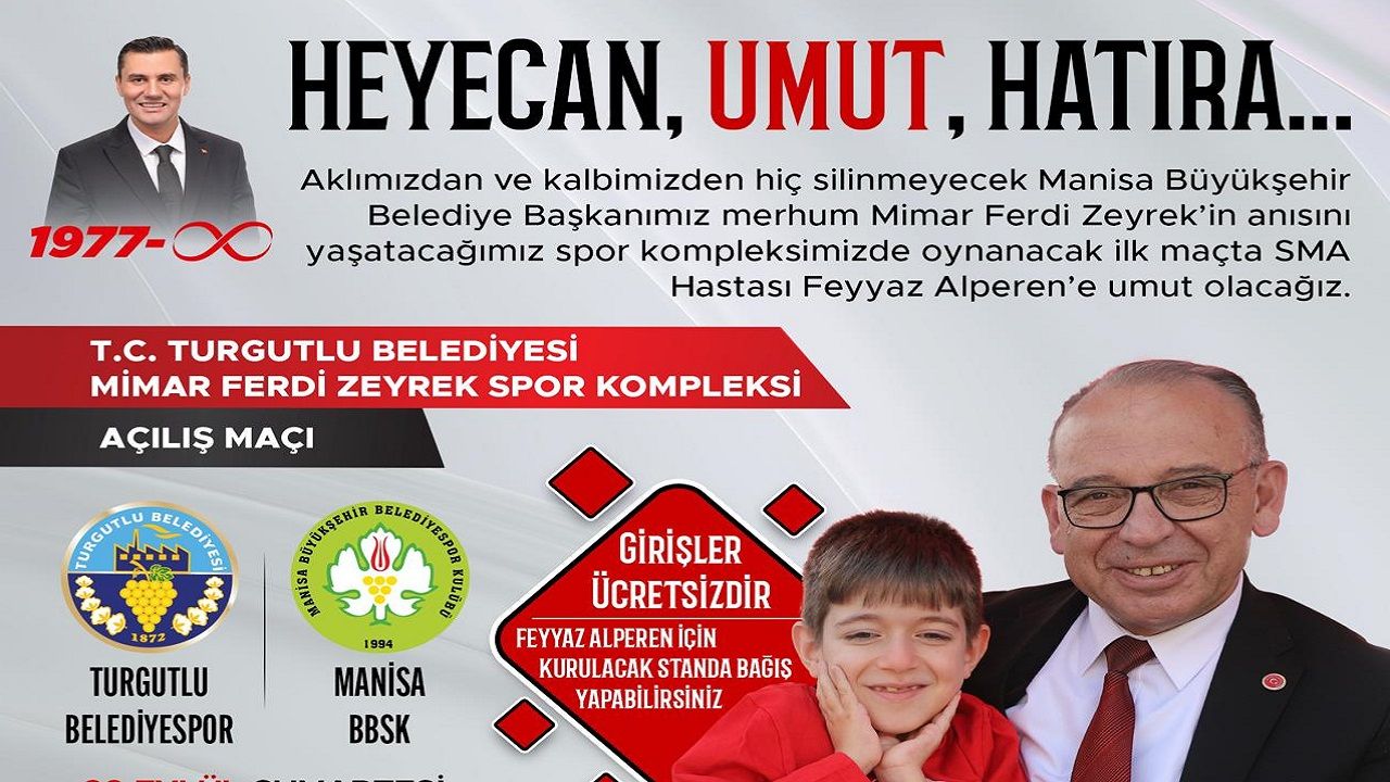 “Spor kompleksimizde Manisa sevdalısı, çocuklar ve gençler için büyük hayalleri olan Büyükşehir Belediye Başkanımız Merhum Ferdi Zeyrek’in ismini ve hatırasını yaşatacağız” diyen Turgutlu Belediye Başkanı Çetin Akın, “Turgutlu’muza kazandırmaktan gurur duyduğumuz, ‘Turgutlu Belediyesi Mimar Ferdi Zeyrek Spor Kompleksi’nin açılış maçını 20 Eylül Cumartesi günü gerçekleştireceğiz. Açılış maçında aynı zamanda Turgutlu’muzun evladı Feyyaz Alperen’in sağlığına kavuşması için yürütülen kampanyaya da hep birlikte destek olacağız. Tüm hemşehrilerimizi Belediyemiz Kadın Voleybol Takımı ve Manisa Büyükşehir Belediyespor Kulübü arasında dostluk ruhuyla oynanacak açılış maçımıza davet ediyoruz” dedi.