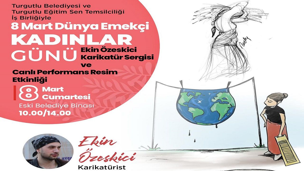 Turgutlu Belediyesi 8 Mart Dünya Emekçi Kadınlar Günü’nde farklı bir etkinliğe imza atacak. Turgutlu Eğitim Sen Temsilciliği ortaklığıyla yapılacak programda karikatürist Ekin Özeskici’nin kadın emeğini farklı yönleriyle ele aldığı resimlerinin yanı sıra kadına yönelik şiddetle ilgili olarak mesajlar da yer alacak. Etkinlikte aynı zamanda karikatürist Ekin Özeskici katılımcılarla birlikte canlı resim etkinliği de yapacak.