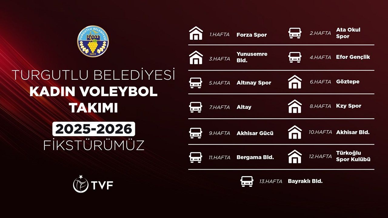 Türkiye Voleybol Federasyonu (TVF) Kadınlar 2.Ligi’nde yer alan Turgutlu Belediyesi Kadın Voleybol Takımı’nın 2025-2026 sezonundaki maç takvimi belli oldu. Çoğunluğu Turgutlu Belediyespor’un altyapısında yetişen oyunculardan oluşan kadın voleybol takımı, ekim ayının ilk haftasında başlayacak sezonda birinci maçını kendi sahasında Forza Spor Takımı’na karşı oynayacak. Turgutlu Belediyespor’un filedeki temsilcisi, 13 hafta sürecek sezonu Bayraklı Belediyesi deplasmanıyla kapatacak.