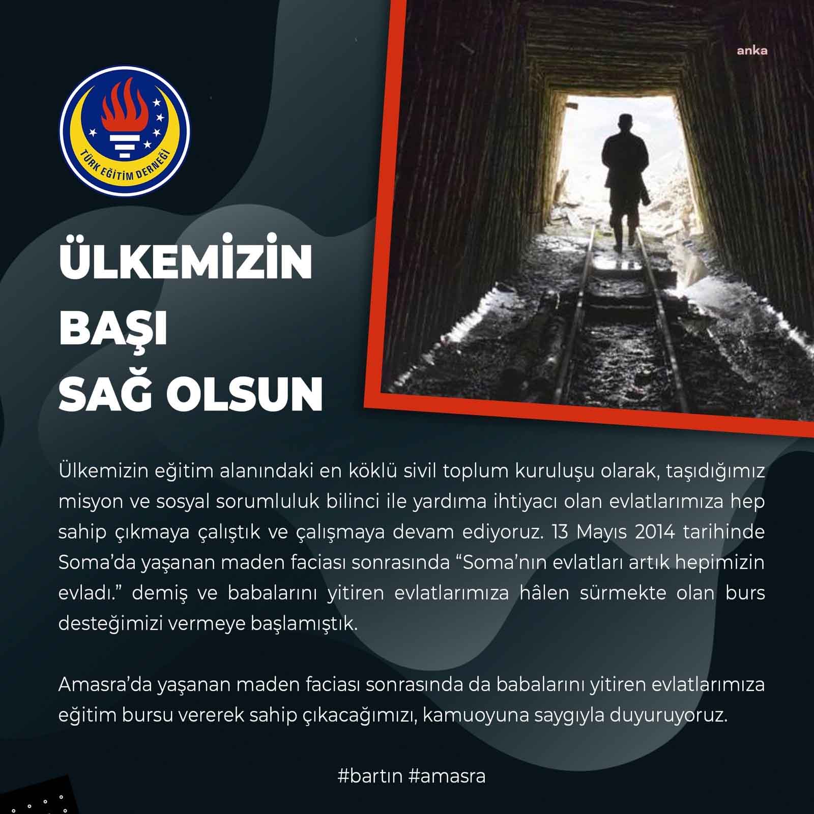 TED, Amasra'da dün meydana gelen ve 41 işçinin yaşamını yitirdiği maden faciasında babalarını kaybeden çocuklara burs desteği sağlayacağını duyurdu. TED, Amasra'daki maden faciasında babalarını kaybeden çocuklara burs desteği sağlayacak. Dernek tarafından yapılan açıklamada, "Amasra’da yaşanan maden faciası sonrasında da babalarını yitiren evlatlarımıza eğitim bursu vererek sahip çıkacağımızı, kamuoyuna saygıyla duyuruyoruz. Ülkemizin başı sağ olsun" denildi. https://tele1.com.tr/erdogan-madenci-yakininin-sorusuna-yanit-veremedi-nasil-ihmal-oldu-718732/ Türk Eğitim Derneği tarafından yapılan açıklama şöyle: "Ülkemizin eğitim alanındaki en köklü sivil toplum kuruluşu olarak, taşıdığımız misyon ve sosyal sorumluluk bilinci ile yardıma ihtiyacı olan evlatlarımıza hep sahip çıkmaya çalıştık ve çalışmaya devam ediyoruz. 13 Mayıs 2014 tarihinde Soma’da yaşanan maden faciası sonrasında 'Soma’nın evlatları artık hepimizin evladı' demiş ve babalarını yitiren evlatlarımıza hâlen sürmekte olan burs desteğimizi vermeye başlamıştık. Amasra’da yaşanan maden faciası sonrasında da babalarını yitiren evlatlarımıza eğitim bursu vererek sahip çıkacağımızı, kamuoyuna saygıyla duyuruyoruz. Ülkemizin başı sağ olsun."