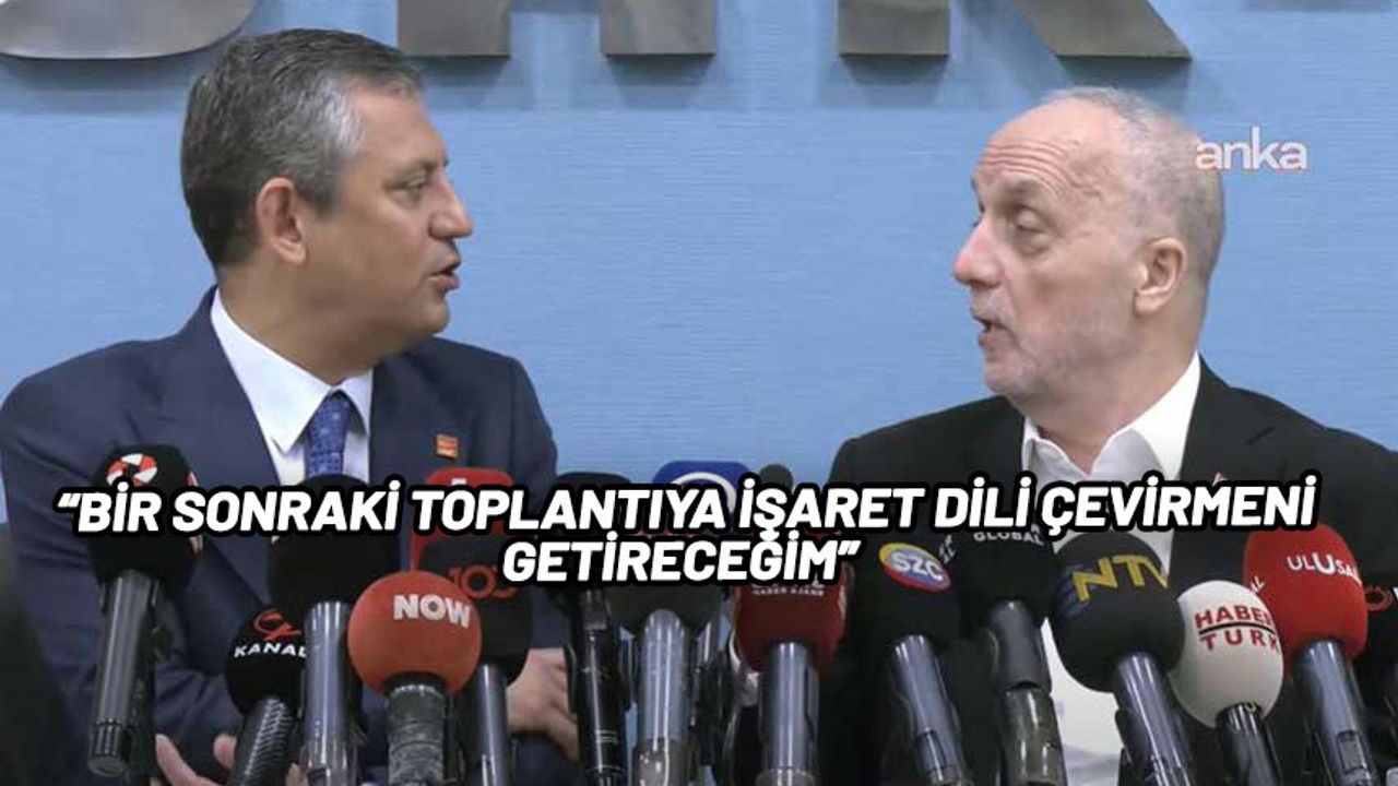 CHP Genel Başkanı Özgür Özel, Türk-İş Genel Merkezi’ni ziyaret etti. Ziyaret sırasında Türk-İş Genel Başkanı Ergün Atalay, tıkanan kamu sözleşmeleri ile ilgili açıklamalarda bulundu. Türk-İş Genel Başkanı Ergün Atalay, kamu sözleşmelerinin tıkanmasının ardından Hazine ve Maliye Bakanı Mehmet Şimşek'e tepki gösterdi. Şimşek'in seslerini duymadığını belirten Atalay, bir daha ki basın açıklamasına işaret dili çevirmeni getireceğini söyledi.