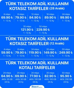 Türk Telekom’un 35 mbps hızdaki interneti 12 Aralık’ta açıklanan adil kullanım kotalı tarifesinde 149 TL olarak açıklanmıştı. Bu önceki adil kullanım kotalı paketin 50 TL üzerinde zamlanmış haliydi. Şimdi ise bu paketin ücreti bir yıl taahhütlü şekilde 122 TL’ye indi. Yani paketin fiyatına 27 TL indirim yapıldı. İşte Türk Telekom internet fiyatlarının önceki fiyatlar ile kıyaslaması.