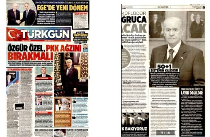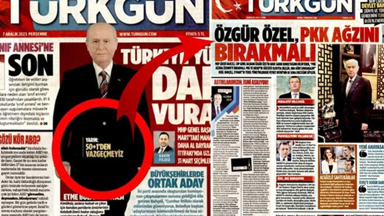 Milliyetçi Hareket Partisi (MHP) Lideri Devlet Bahçeli, partisinin yayın organı Türkgün gazetesine röportaj serisi verdi. Gazetenin dünkü manşetinde, bugün üçüncü kısmı yayımlanan röportajın anonsu duyuruldu. Gazete, dünkü manşette Erdoğan ile arasındaki en bariz görüş ayrılıklarından birini oluşturan cumhurbaşkanlığı seçilme şartı olan yüzde 50+1 konusu ile ilgili Bahçeli’nin “Vazgeçmeyeceğiz” ifadesini öne çıkardı. Dün anonsu manşetten verilen röportajın bugün yayımlanan kısmında ise manşette bahsedilmeyen “50+1” konusu dokuzuncu sayfada tek bir soru ve yanıt ile yer aldı. Dün öne çıkarılan “Vazgeçmeyiz” ifadesine ise haberde yer verilmedi. [caption id="attachment_967098" align="alignnone" width="690"]