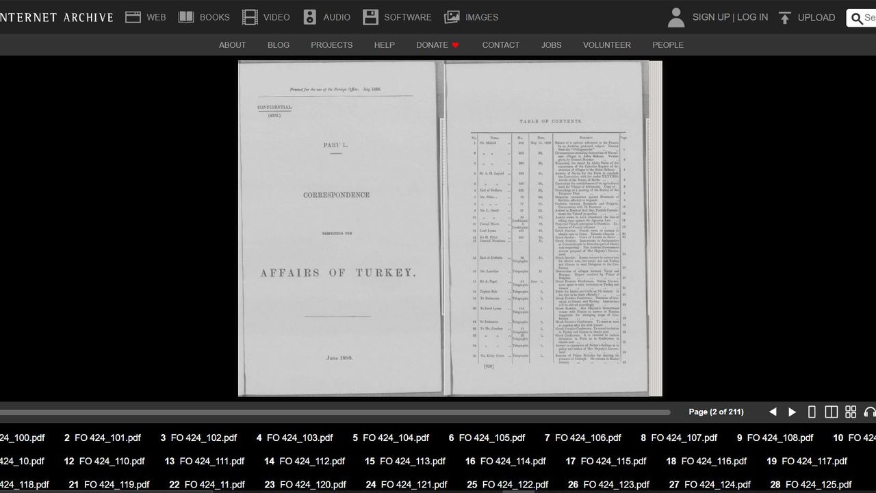 1841-1957 yılları arasındaki Türk Dışişleri bakanlıkları ile İngiliz Hükumeti arasındaki yazışmalar internet ortamında "Foreign Office: Confidential Print Turkey 1841-1957" başlığı ile erişime açıldı. Toplamda 8 GB büyüklüğünde 300 dosyadan oluşan belgeler daha önce sadece para karşılığında erişimi mümkündü https://archive.org/details/turkey-1841-1957/FO%20424_99/page/n1/mode/2up