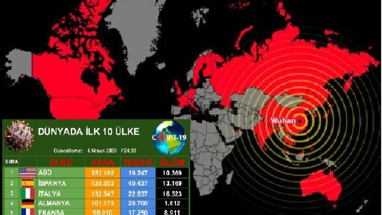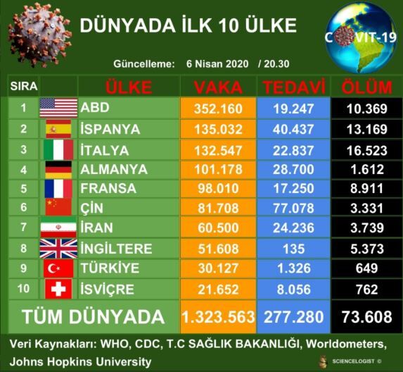 Sağlık Bakanlığı'nın bugün (6 Nisan 2020 Pazartesi) açıkladığı son veriler, diğer ülkelerdeki verilerle karşılaştırıldığında, Türkiye Koronavirüs salgınındaki dünya sıralamasında toplam tanı sayısında 9; can kayıplarında da 12. sırada yer aldı.