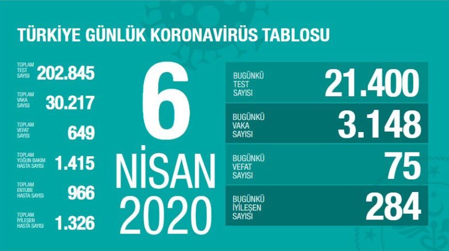 https://tele1.com.tr/turkiye-koronavirus-vaka-ve-can-kaybinda-dunyada-kacinci-sirada-148996/ Sağlık Bakanı'nın açıkladığı verilere göre son 24 saatte 3 bin 148 vaka daha tespit edildi. Türkiye'deki vaka sayısı 30 bin 217 olurken, toplam yaşamını yitirenlerin sayısı ise 649'a yükseldi. Bakanlıktan açıklanan bilgilere göre 966 entübe, bin 415 yoğun bakım hastası bulunuyor. Türkiye'de koronavirüsü atlatıp taburcu olan kişi sayısı ise bin 326 olarak ifade edildi. https://tele1.com.tr/can-kaybi-648-vaka-sayisi-900-bin-almanyanin-sirri-halk-yasak-istiyor-derdi-basarisizligini-gizlemek-asener-virus-evime-kadar-geldi-2-havalimani-hastane-oluyor-6-nisan-gunun-148883/ Sağlık Bakanı Fahrettin Koca yaptığı paylaşımda, "Günlük test sayımız yakında 30.000’i bulacak. İyileşen hasta sayımızdaki artış hızı devam ediyor. Artan test sayısına göre vaka sayısındaki artış düşük seyrediyor. Virüs, gücünü temas ortamından alıyor. Virüse bu fırsatı tanımayalım. Evde kalalım." ifadelerinde bulundu.Günlük test sayımız yakında 30.000’i bulacak. İyileşen hasta sayımızdaki artış hızı devam ediyor. Artan test sayısına göre vaka sayısındaki artış düşük seyrediyor. Virüs, gücünü temas ortamından alıyor. Virüse bu fırsatı tanımayalım. Evde kalalım.https://t.co/RVlhe7786O pic.twitter.com/WQtAifsNF2