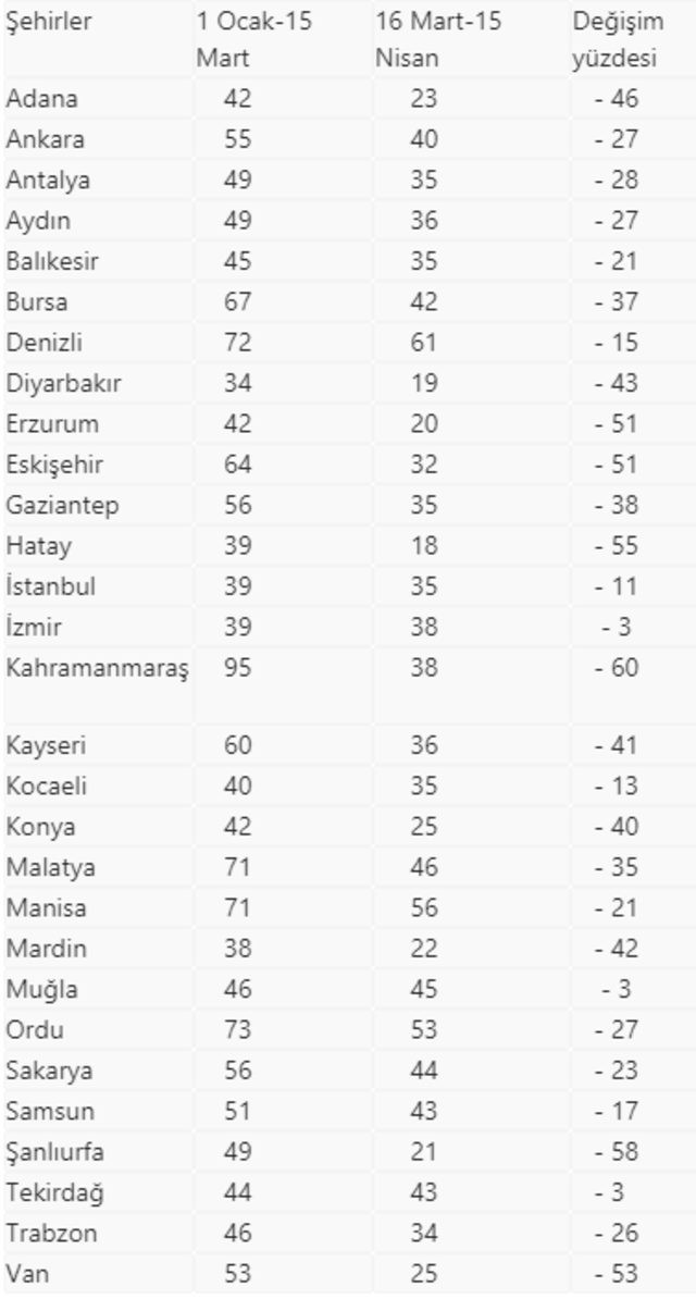 Türkiye'nin en kalabalık şehri olan megakent İstanbul'da hava kirliliği 16 Mart tarihinden sonra yüzde 11 azaldı. Nüfus olarak en kalabalık büyükşehirlerde hava kirliliği başkent Ankara'da yüzde 27, Bursa'da yüzde 37, Antalya'da yüzde 28 ve Adana'da yüzde 46 azalarak kayıtlara geçti.