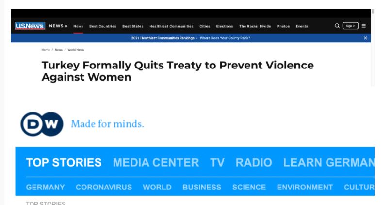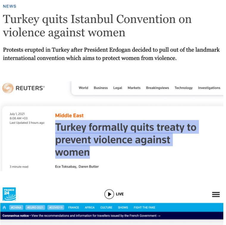 Türkiye’nin 2011’de ilk imzacı olduğu ve 2014’te yürürlüğe koyduğu, adını imzalandığı şehir İstanbul’dan alan “Kadınlara Yönelik Şiddet ve Aile İçi Şiddetin Önlenmesi ve Bunlarla Mücadeleye İlişkin Avrupa Konseyi Sözleşmesi”, 19 Mart’ta AKP'li Cumhurbaşkanı Erdoğan’ın imzasıyla bir gecede feshedildi. Reuters, U.S News, DW, France 24 İstanbul Sözleşmesi kararını "Türkiye, kadına yönelik şiddeti önleme anlaşmasını resmen feshetti" başlığıyla manşetlerine taşıdı. İşte o manşetler: