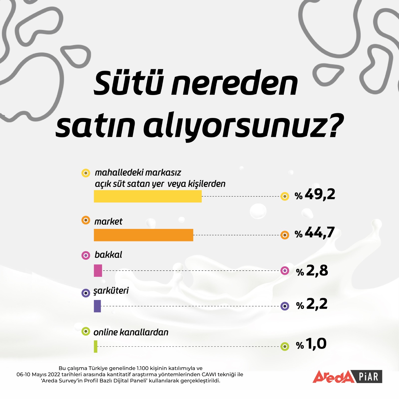 Areda Piar’ın bin 100 katılımcıyla gerçekleştiği süt tüketim alışkanlıklarına ilişkin anketin sonuçları, Türkiye’nin yüzde 49,2’sinin süt satın alırken mahalledeki markasız açık süt satan yer veya kişileri tercih ettiğini ortaya koydu.