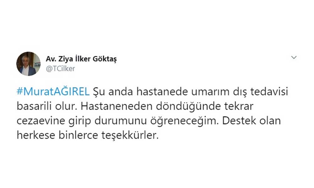 Ağırel’in avukatlarından Ziya İlker Göktaş Twitter hesabından yaptığı açıklamada, Ağırel’in tedavi için hastaneye götürüldüğünü söyledi.