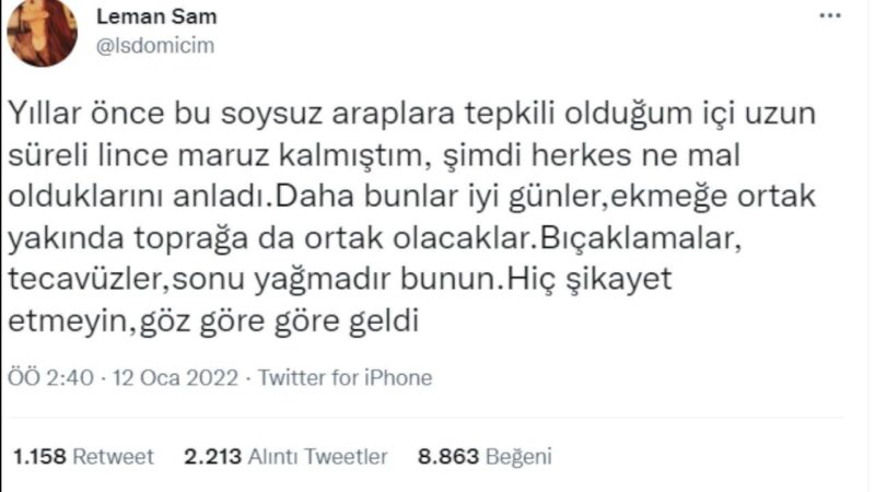 Şarkıcı Leman Sam'ın Katarlı bir sürücünün Bahçeşehir'de köpeğe çarpıp kaçmasına ilişkin olarak yaptığı ve "Soysuz Araplar" ifadelerini kullandığı paylaşımı tepkilere neden oldu. Twitter, Sam'ın tweet'ini sildi. Leman Sam, attığı tweet'te "Yıllar önce bu soysuz Araplar'a tepkili olduğum için uzun süreli linçe maruz kalmıştım, şimdi herkes ne mal olduklarını anladı. Daha bunlar iyi günler, ekmeğe ortak yakında toprağa da ortak olacaklar. Bıçaklamalar, tecavüzler, sonu yağmadır bunun. Hiç şikayet etmeyin, göz göre göre geldi" ifadelerini kullandı.