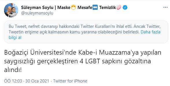 Soylu’nun "Boğaziçi Üniversitesi'nde Kabe fotoğrafının yere serildiği" iddiası sonrası Twitter hesabından yaptığı paylaşım ile "Tuzağa düşmeyin" açıklamasınının bulunduğu bugünkü tweet'ine "nefret davranışı" uyarısı eklendi. Kullanıcılar Soylu'nun ilgili paylaşımları üzerinde "Bu Tweet, nefret davranışı hakkındaki Twitter Kuralları'nı ihlal etti. Ancak Twitter, Tweetin erişime açık kalmasının kamu yararına olabileceğini belirledi" uyarısıyla karşılaşıyor.