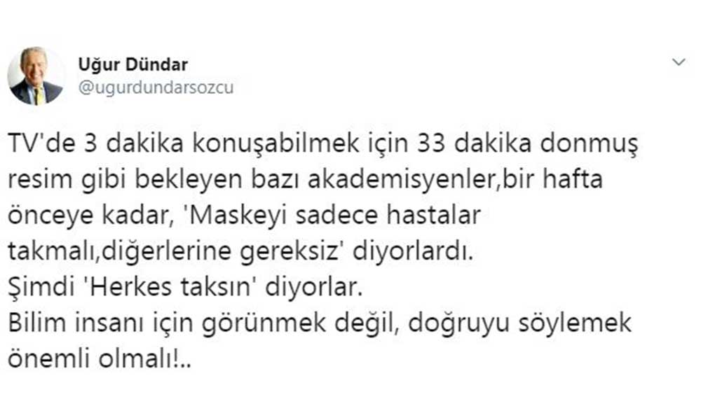 Duayen Gazeteci Uğur Dündar, “TV'de 3 dakika konuşabilmek için 33 dakika donmuş resim gibi bekleyen bazı akademisyenler, bir hafta önceye kadar, 'Maskeyi sadece hastalar takmalı, diğerlerine gereksiz' diyorlardı. Şimdi 'Herkes taksın' diyorlar” dedi.