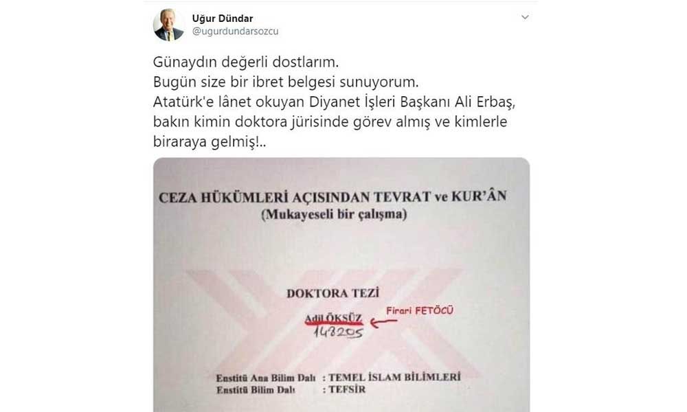 O günden bu güne tartışmalar sürerken usta gazeteci Uğur Dündar, Ali Erbaş ile ilgili dikkat çeken bir paylaşımda bulundu. Dündar, Ali Erbaş'ın FETÖ firarisi Adil Öksüz'ün doktora jürisinde yer aldığını belgeleriyle duyurdu. Dündar sosyal medya hesabından yaptığı paylaşımda şunları ifade etti: "Günaydın değerli dostlarım.Bugün size bir ibret belgesi sunuyorum. Atatürk'e lânet okuyan Diyanet İşleri Başkanı Ali Erbaş, bakın kimin doktora jürisinde görev almış ve kimlerle biraraya gelmiş!.." https://tele1.com.tr/canli-kilicdaroglu-yeni-bir-anayasa-yapacagiz-195119/ https://tele1.com.tr/aksenerden-diyanet-isleri-baskani-erbasa-tepki-194931/