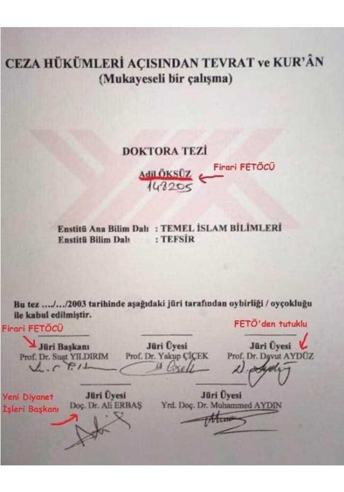 Ayasofya'da kılınan Cuma namazının hutbesinde Atatürk'e lanet okuyan Diyanet İşleri Başkanı Ali Erbaş'ın FETÖ firarisi Adil Öksüz'ün doktora jürisinde imzası olduğu ortaya çıktı.