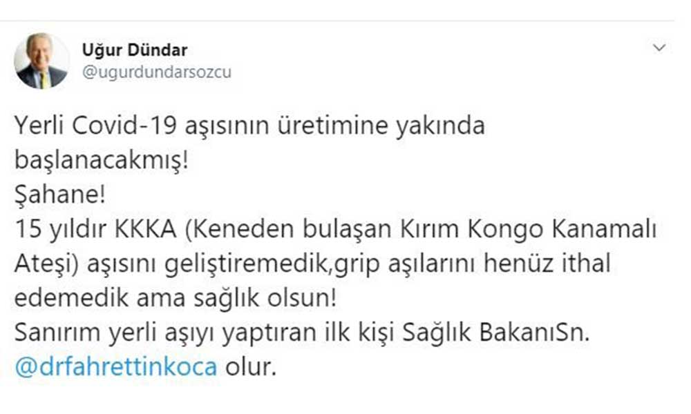 Duayen gazeteci Uğur Dündar sosyal medya hesabından yerli korona virüs aşısı ve Sağlık Bakanı Fahrettin Koca ile ilgili paylaşımda bulundu. Yerli korona virüs aşısının üretimine yakında başlanacak olmasına sevinen Dündar, şunları yazdı: "Yerli Covid-19 aşısının üretimine yakında başlanacakmış!Şahane!15 yıldır KKKA (Keneden bulaşan Kırım Kongo Kanamalı Ateşi) aşısını geliştiremedik,grip aşılarını henüz ithal edemedik ama sağlık olsun!Sanırım yerli aşıyı yaptıran ilk kişi Sağlık Bakanı Sayın Fahrettin Koca olur."