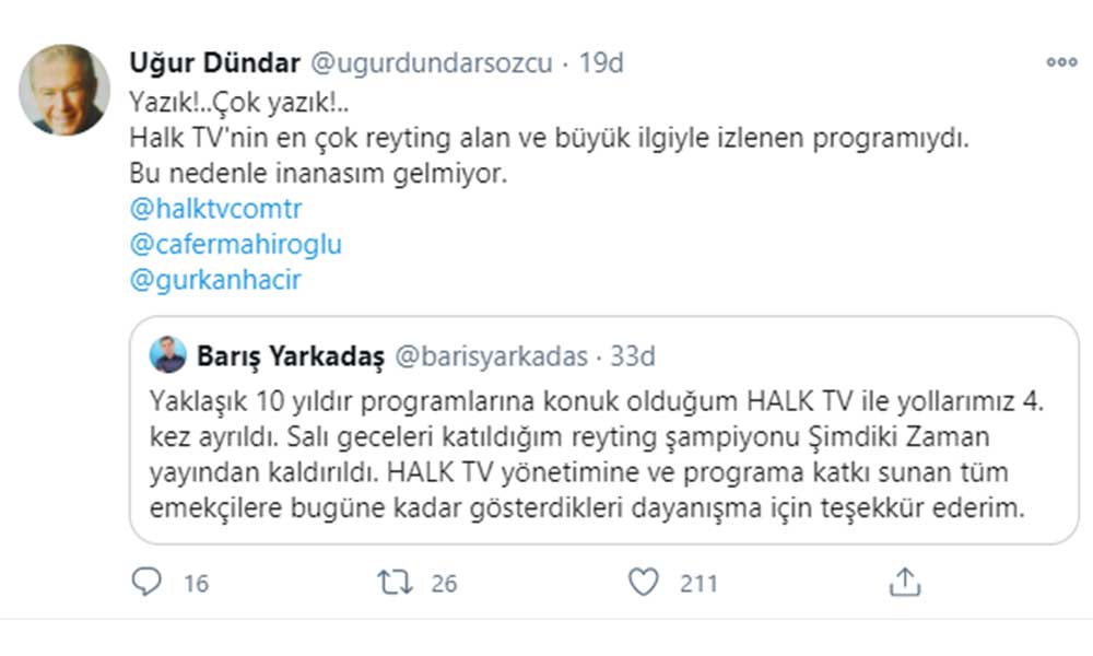 HALK TV'de yayımlanan Şimdiki Zaman - Siyaset programının kaldırılmasına duayen gazeteci Uğur Dündar tepki gösterdi.