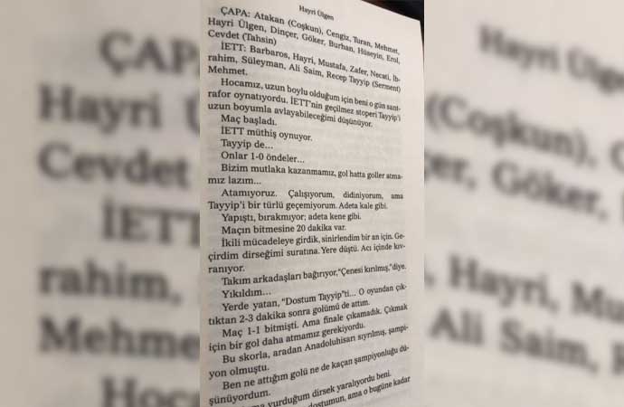 “Maç başladı. İETT müthiş oynuyor. Tayyip de… Onlar 1-0 öndeler… Bizim mutlaka kazanmamız, gol hatta goller atmamız lazım… Atamıyoruz. Çalışıyorum, didiniyorum ama Tayyip’i bir türlü geçemiyorum. Adeta kale gibi.
