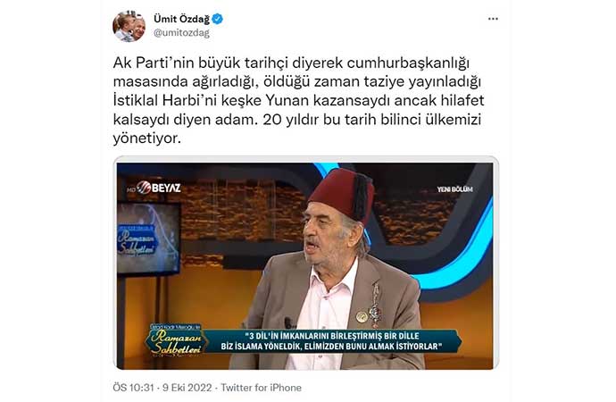 "Ak Parti’nin büyük tarihçi diyerek cumhurbaşkanlığı masasında ağırladığı, öldüğü zaman taziye yayınladığı İstiklal Harbi’ni keşke Yunan kazansaydı ancak hilafet kalsaydı diyen adam. 20 yıldır bu tarih bilinci ülkemizi yönetiyor."