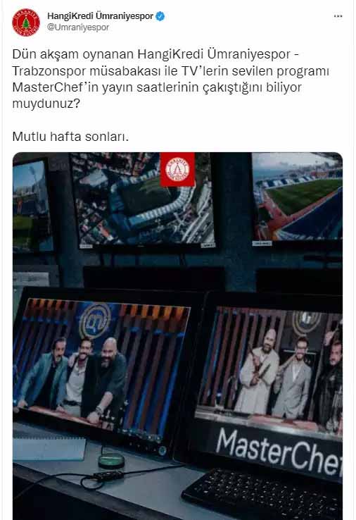 Spor Toto Süper Lig'in 5. haftasında HangiKredi Ümraniyespor ile Trabzonspor, Recep Tayyip Erdoğan Stadı'nda karşılaştı. Karşılaşma Trabzonspor'un 1-0'lık galibiyetiyle sonuçlandı. Maçta, Ümraniyespor'un penaltı beklediği pozisyon sosyal medyada gündem oldu. Pozisyonla ilgili VAR'dan orta hakeme herhangi bir çağrı gelmedi. Ümraniyespor'un sosyal medya hesabından konuyla ilgili VAR hakemlerine gönderme içeren bir paylaşım geldi. Paylaşımda VAR hakemlerinin Masterchef izlediği imasında bulunuldu. Paylaşımda şu ifadeleri kullandı: "Dün akşam oynanan HangiKredi Ümraniyespor - Trabzonspor müsabakası ile TV’lerin sevilen programı MasterChef’in yayın saatlerinin çakıştığını biliyor muydunuz? Mutlu hafta sonları." https://tele1.com.tr/trabzonspor-umraniyesporu-1-0-maglup-etti-692378/
