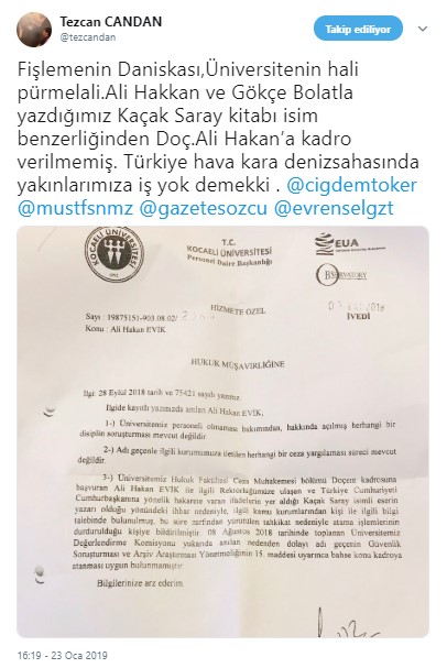 Kitabın yazarlarından Tezcan Karakuş Candan, Kocaeli Üniversitesi’nin Doç. Dr. Ali Hakan’ın başvurusunu reddine dair yaptığı yazışmayı paylaştı. Candan, “Fişlemenin daniskası, üniversitenin hali pürmelali. Ali Hakkan ve Gökçe Bolat'la yazdığımız Kaçak Saray kitabı isim benzerliğinden Doç. Ali Hakan’a kadro verilmemiş. Türkiye hava kara deniz sahasında yakınlarımıza iş yok demek ki” diye tepki gösterdi.