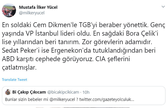 "En soldaki Cem Dikmen'le TGB'yi beraber yönettik. Genç yaşında VP İstanbul lideri oldu. En sağdaki Bora Çelik'i lise yıllarından beri tanırım. Zor görevlerin adamıdır. Sedat Peker'i ise Ergenekon'da tutuklandığından beri ABD karşıtı cephede görüyoruz. CIA şeflerini çatlatmışlar"