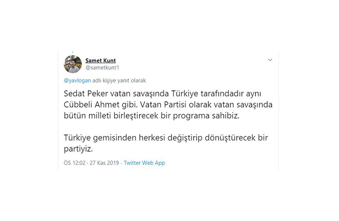 Vatan Partisi'nin gençlik yapılanması Öncü Gençlik'in Genel Yürütme Kurulu üyesi Samet Kunt ise, "Sedat Peker vatan savaşında Türkiye tarafındadır aynı Cübbeli Ahmet gibi. Vatan Partisi olarak vatan savaşında bütün milleti birleştirecek bir programa sahibiz. Türkiye gemisinden herkesi değiştirip dönüştürecek bir partiyiz" ifadelerini kullandı.