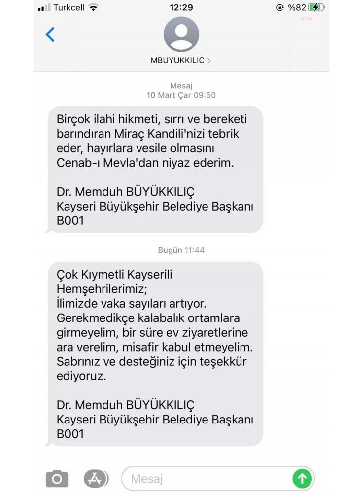 AKP’li Kayseri Büyükşehir Belediye Başkanı Memduh Büyükkılıç, yurttaşlara gönderdiği mesajda “İlimizde vaka sayıları artıyor. Gerekmedikçe kalabalık ortamlara girmeyelim, bir süre ev ziyaretlerine ara verelim, misafir kabul etmeyelim. Sabrınız ve desteğiniz için teşekkür ediyoruz” dedi.