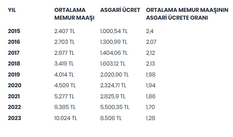2015 yılında ortalama memur aylığı asgari ücretin 2,4 katı iken 2023 yılı için ortalama memur aylığı yüzde 16,4’lük zam ile asgari ücretin 1,28 katına geriledi. TÜİK, tüm ücretleri asgari ücret seviyesine çekmekte.
