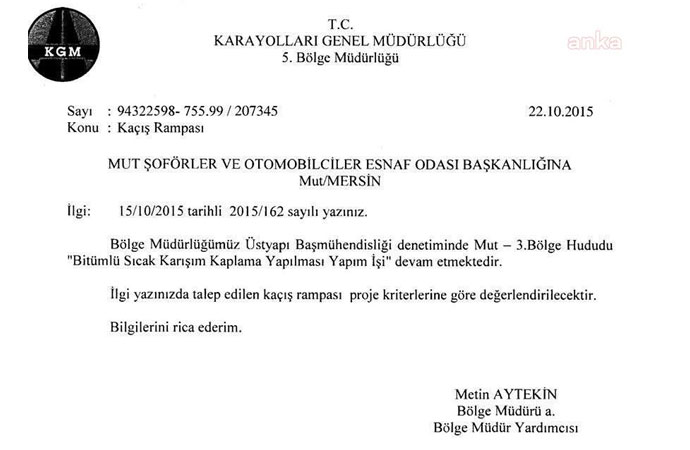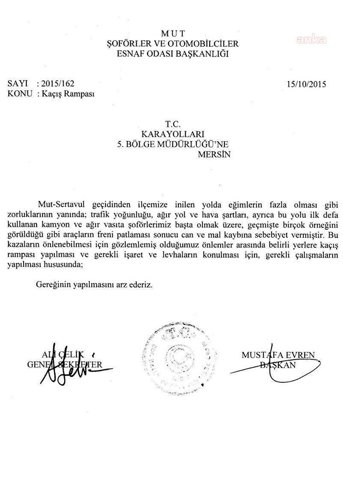 Kazanın meydana geldiği yolla ilgili olarak 5 yıl önce yapılan bir yazışma ise ihmal iddialarını gündeme getirdi. Mut Şoförler ve Otomobilciler Esnaf Odası, 10 Ekim 2015’te Karayolları 5. Bölge Müdürlüğüne yazdığı yazıda, yoldaki eğimin fazla olması nedeniyle belirli bölgelere kaçış rampası yapılmasını, gerekli işaret ve levhaların konulmasını istedi. Mut Şoförler ve Otomobilciler Esnaf Odası Başkanı Mustafa Evren imzasıyla bölge müdürlüğüne gönderilen yazıda, “Yolda eğimin fazla olması gibi zorlukların yanında; trafik yoğunluğu, ağır yol ve hava şartları, ayrıca bu yolu ilk defa kullanan kamyon ve ağır vasıta şöförlerimiz başta olmak üzere, geçmişte birçok örneğini gördüğümüz gibi araçların freni patlaması sonucu can ve mal kaybına sebebiyet vermiştir” ifadeleri yer aldı. Karayolları 5. Bölge Müdürlüğü tarafından, bir hafta sonra 22 Ekim 2015’te yazılan yanıt yazısında ise“…ilgi yazınızda talep edilen kaçış rampası proje kriterlerine göre değerlendirilecektir” denildi. Yol üzerinde inşa edilecek kaçış rampalarından biri, kazanın gerçekleştiği yerin 300 ila 500 metre öncesinde projelendirildi. Ancak Mut Şoförler ve Otomobilciler Esnaf Odası Başkanı’nın yazılı ve sözlü uyarılarına rağmen söz konusu proje hayata geçirilemedi.‘DAHA KAÇ KİŞİNİN HAYATINI KAYBETMESİNİ BEKLİYORSUNUZ?’