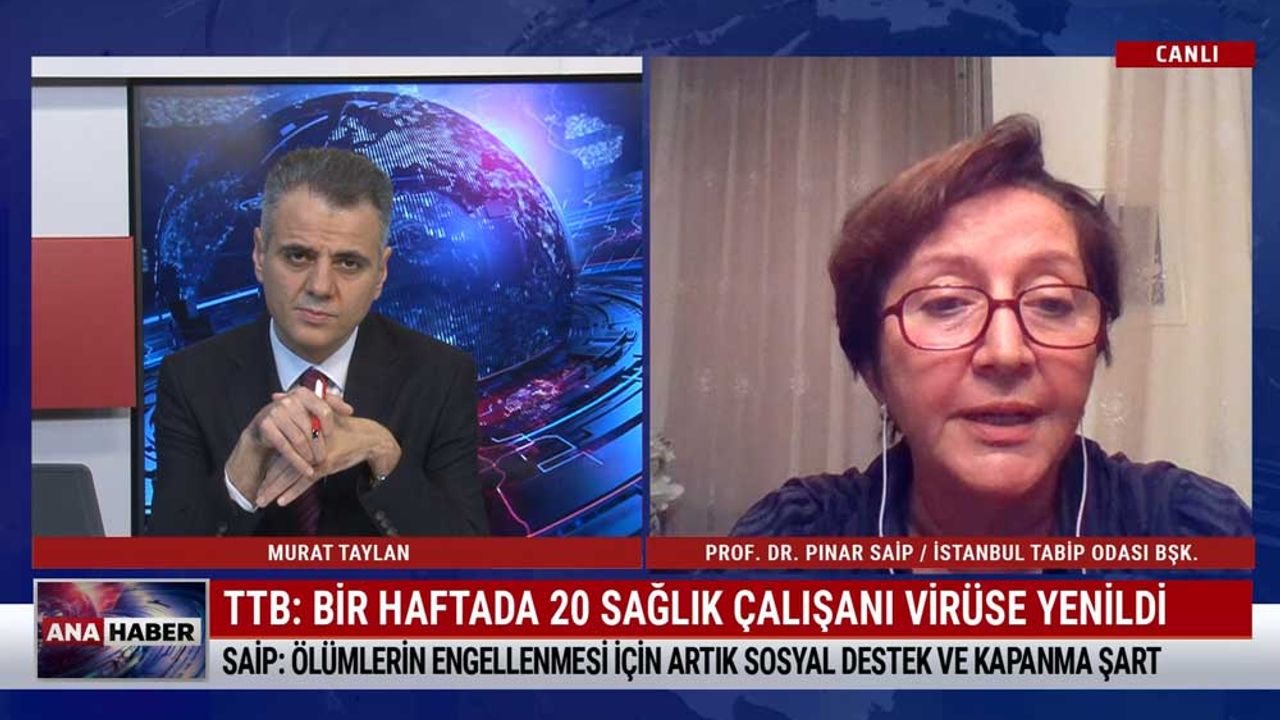 Murat Taylan'ın sunduğu TELE1 Ana Haber'in bugünkü konuğu, İstanbul Tabip Odası Başkanı Prof. Dr. Pınar Saip oldu. Saip, bir haftada koronavirüs nedeniyle 20 sağlık emekçisinin hayatını kaybetmesiyle ilgili açıklamalarda bulundu.