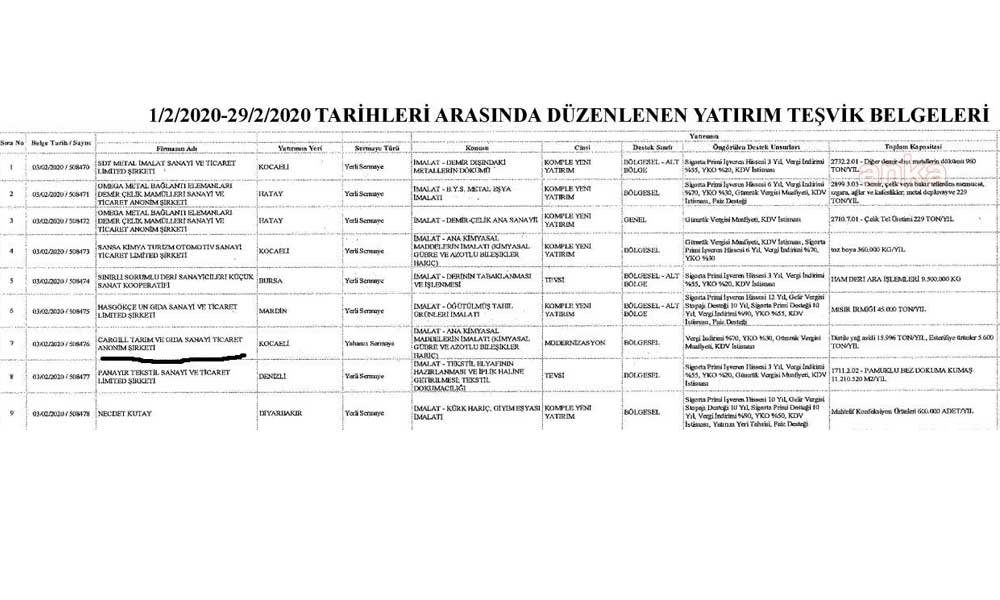 Sanayi ve Teknoloji Bakanlığı, 1-29 Şubat tarihleri arasında düzenlene yatırım teşvik belgelerini 22 Nisan günü Resmi Gazete’de açıkladı. 671 şirkete yatırım teşviki verilirken, bu şirketler arasında şeker fabrikalarının özelleştirmesiyle gündeme gelen Nişasta Bazlı Şeker (NBŞ) üreticisi Cargill de yer aldı. ABD merkezli şirkete yüzde 70 vergi indirimi uygulanacak, KDV ve gümrük vergisinden istisna tutacak. Bakanlık tarafından kurumlar vergisi indirimi de yapılarak, şirketin 44 milyon 659 bin 79 liralık yatırımına da ‘katkı sunulacak’.
