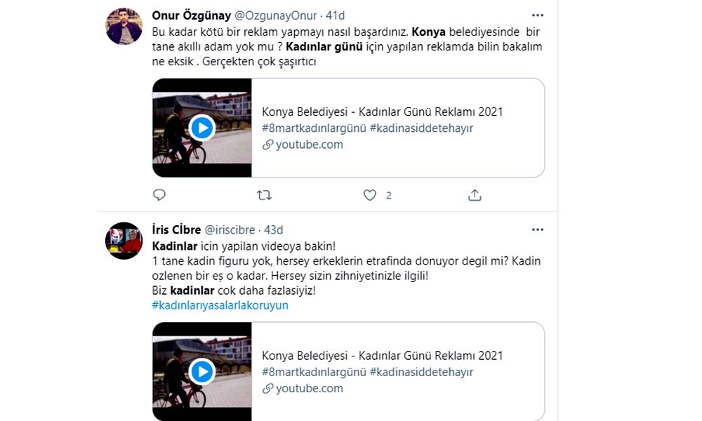 AKP'li Konya Belediyesi, 8 Mart Dünya Emekçi Kadınlar Günü'nde tek bir kadının bile yer almadığı Kadınlar Günü videosu yayınladı. Videoda kadınların bir birey olarak değil de, erkeklerin eşi ve ihtiyaçlarını karşılayan bir eşya gibi sunulması sosyal medyada tepki topladı.