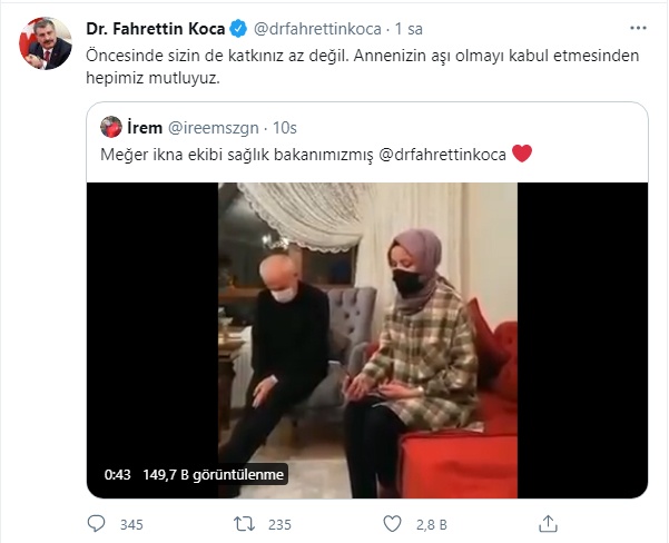 Sağlık Bakanı Fahrettin Koca, yeni tip koronavirüse (Kovid-19) karşı süren aşılama çalışmalarıyla ilgili olarak kişisel Twitter hesabında yeni bir paylaşımda bulundu. Sağlık Bakanı Fahrettin Koca takipçisinin kendisine yaptığı " ikna ekibi Sağlık Bakanımızmış" paylaşımına "Öncesinde sizin de katkınız az değil. Annenizin aşı olmayı kabul etmesinden hepimiz mutluyuz" yanıtını verdi.