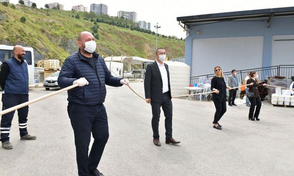 Çiğli Belediyesi işçileri, koronavirüs tedbirleri doğrultusunda 1 Mayıs İşçi ve Emekçi Bayramı'nı alınan önlemler kapsamında kutladı. 1 Mayıs halayı çeken işçiler, sosyal mesafeyi fırça saplarıyla sağladı.