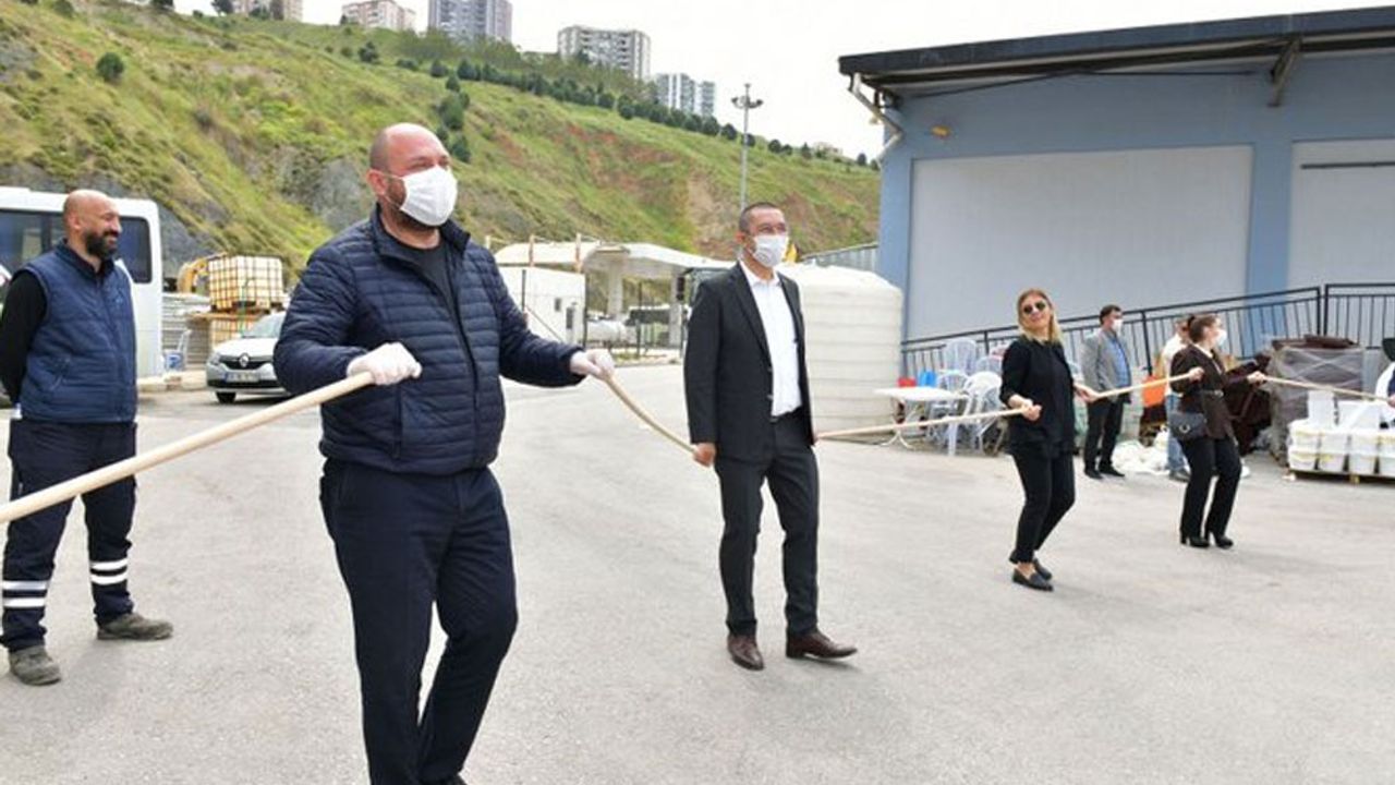 Çiğli Belediyesi işçileri, koronavirüs tedbirleri doğrultusunda 1 Mayıs İşçi ve Emekçi Bayramı'nı alınan önlemler kapsamında kutladı. 1 Mayıs halayı çeken işçiler, sosyal mesafeyi fırça saplarıyla sağladı.