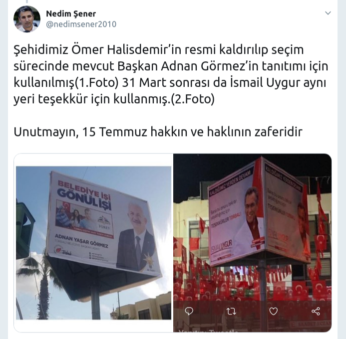 Gazeteci Nedim Şener de twitter hesabından yaptı. Şener Ömer Halisdemir pankartının seçim öncesi AKP tarafından kaldırıldığını ve AKP adayının afişinin asıldığını belirtti. Şener, "Şehidimiz Ömer Halisdemir’in resmi kaldırılıp seçim sürecinde mevcut Başkan Adnan Görmez’in tanıtımı için kullanılmış(1.Foto) 31 Mart sonrası da İsmail Uygur aynı yeri teşekkür için kullanmış.(2.Foto) Unutmayın, 15 Temmuz hakkın ve haklının zaferidir. Torbalı Belediye Başkanı seçilen İsmail Uygur, mazbatasını alır almaz Şehit Ömer Halisdemir’in resminin aynı yere asılacağını söyledi." tweetini paylaştı. Ömer Halisdemir resmi
