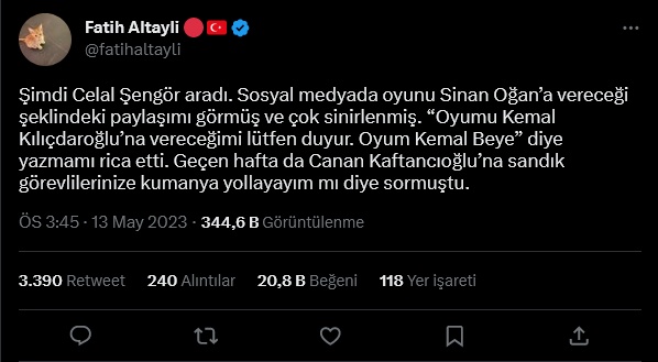 "Şimdi Celal Şengör aradı. Sosyal medyada oyunu Sinan Oğan’a vereceği şeklindeki paylaşımı görmüş ve çok sinirlenmiş. “Oyumu Kemal Kılıçdaroğlu’na vereceğimi lütfen duyur. Oyum Kemal Beye” diye yazmamı rica etti. Geçen hafta da Canan Kaftancıoğlu’na sandık görevlilerinize kumanya yollayayım mı diye sormuştu."