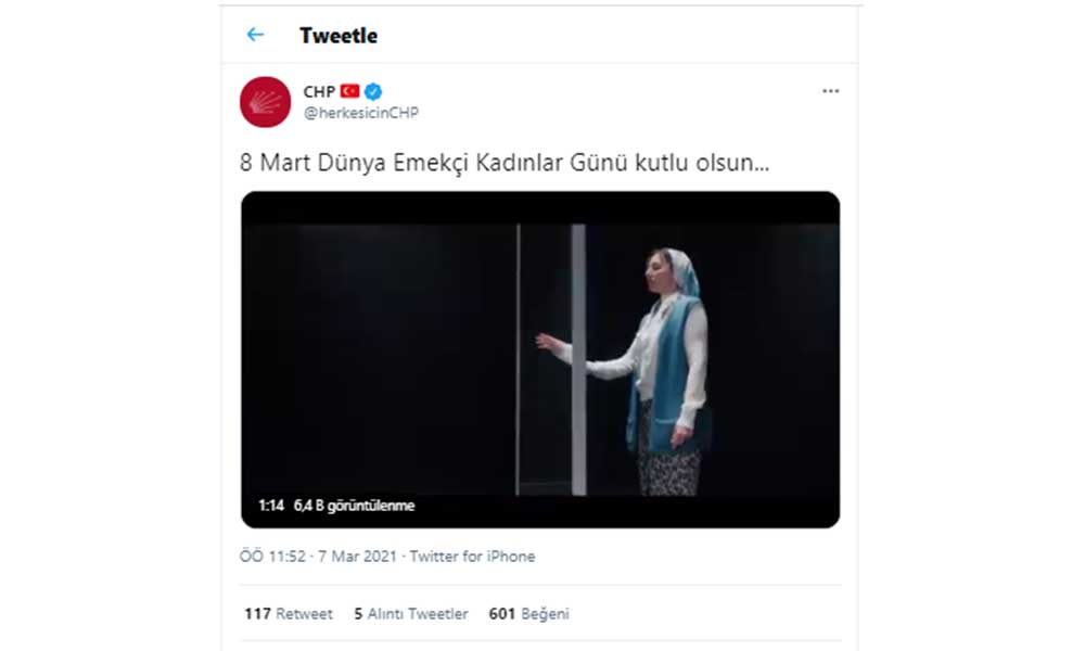 CHP'nin sosyal medya hesabından 8 Mart Dünya Emekçi Kadınlar Günü'nde videolu mesaj paylaşıldı. Videoda kadınların sorunlarına dikkat çekildi. CHP'nin sosyal medya hesabından yapılan paylaşım ise şöyle oldu: 8 Mart Dünya Emekçi Kadınlar Günü kutlu olsun...